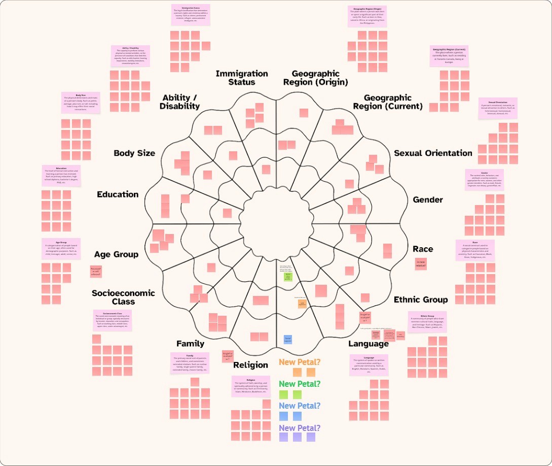 Our contemporary iteration of the Power Flower began as a collaborative academic project in 2023 within OCAD University’s Strategic Foresight & Innovation program, developed by a five-person team: Morgan Bath, Muskaan Chandwani, Danny Ghantous, Beyza Ozmen, and Nadia Tabassum. During this initial phase, the team introduced the third, context-dependent ring which expanded the original binary model to reflect identities that shift between advantage and disadvantage depending on environment, culture, or situation. This foundational adaptation significantly broadened the tool’s reflective capacity.